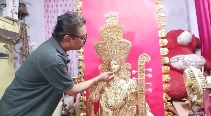 দুর্গাপুর, ১ ফেব্রুয়ারী :দুর্গাপুর স্টিল টাউনশিপের এ-জোন হর্ষবর্ধন রোডের বাসিন্দা অমিত সরকার পেশায় গান এবং আঁকার শিক্ষক।তিনি নিজস্ব বাসভবনে ছাত্র-ছাত্রীদের গান এবং ছবি আঁকা শেখান।২০০৫ সাল থেকে অমিতবাবুর নেশা এবং ইচ্ছে তিনি বাগদেবী নিজের হাতেই তৈরি করবেন। এবছর অমিতবাবু পাস্তা দিয়ে সরস্বতীর মূর্তি তৈরি করেছেন। এবার পাঁচটা দিয়ে তৈরি সেই বাগদেবীর আরাধনা হবে অমিত সরকারের নিজস্ব সংগীত এবং অঙ্কন প্রশিক্ষণ বিদ্যালয়ে।নানান ধরনের এবং নানান আকৃতির পাস্তা দিয়েই তৈরি হয়েছে বাগদেবী। দীর্ঘ প্রায় দেড় থেকে দুই মাস ধরে অমিত সরকার এই অভিনব বাগদেবীর মূর্তি তৈরি করছেন। যদিও ২০০৫ সাল থেকেই তার বিদ্যালয়ে প্রত্যেক বছর বাগদেবীর মূর্তি তৈরিতে অভিনবত্ব থাকে। তার স্কুলের শিক্ষার্থীরাই শুধু নয় বহু মানুষ এই আকর্ষণীয় বাগদেবীর মূর্তি দেখতে ছুটে আসেন তার স্কুলে। শুরুটা করেছিলেন কাঁচ ভাঙ্গা দিয়ে সরস্বতীর মূর্তি তৈরি করে। শিক্ষার্থী থেকে সাধারণ মানুষ সকলেই প্রশংসায় ভরিয়ে দিয়েছিলেন অমিতবাবুর এই সৃষ্টিকে। তারপর থেকে তিনি আর থামেননি।