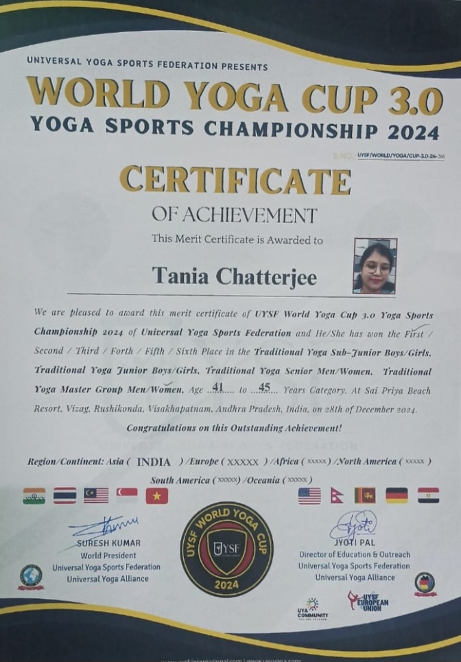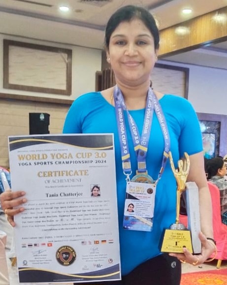 ইউনিভার্স যোগাসনের পক্ষ থেকে গত ২৮ ডিসেম্বর অন্ধ্রপ্রদেশের ভাইজ্যাকে ওয়ার্ল্ড যোগা চ্যাম্পিয়নশিপ আয়োজিত হয়। সেখানে ১৪টি দেশের অন্তত ৭০০ জন প্রতিযোগী অংশ গ্রহণ করেন। ট্রাডিশনাল ও রিদমিক এই দুটি বিভাগ ছিল। ট্রাডিশনাল যোগায় ৪১ থেকে ৪৫ বছর বয়সীদের বিভাগে প্রথমস্থান অধিকার করেন দুর্গাপুরের তানিয়া চট্টোপাধ্যায়। চ্যাম্পিয়নের শংসাপত্র এবং স্বর্ণপদক জেতেন তিনি।