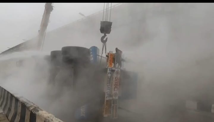 ভোররাতে ভয়াবহ কান্ড।নিয়ন্ত্রণ হারিয়ে ডিভাইডারে ধাক্কা মেরে উল্টে গেল হাইড্রোক্লোরিক অ্যাসিড ভর্তি ট্যাঙ্কার। সেই ট্যাঙ্কার ফুটো হয়ে বের হতে লাগলো অ্যাসিড। অ্যাসিডের ঝাঁঝালো ধোঁয়ার সাথে
